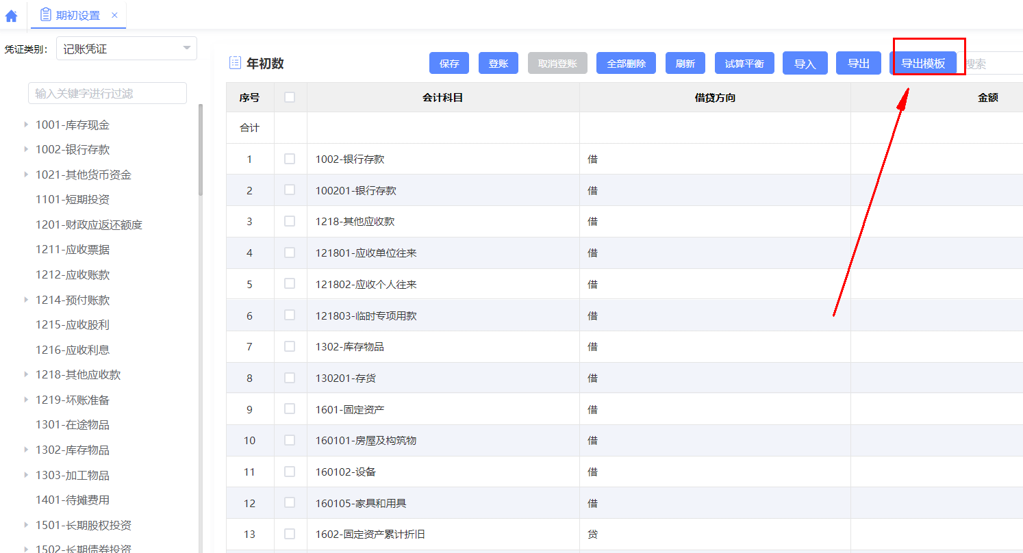 - 登录G1核算云平台,点击【会计基础设置】-【期初数设置】-点击导出模板按钮