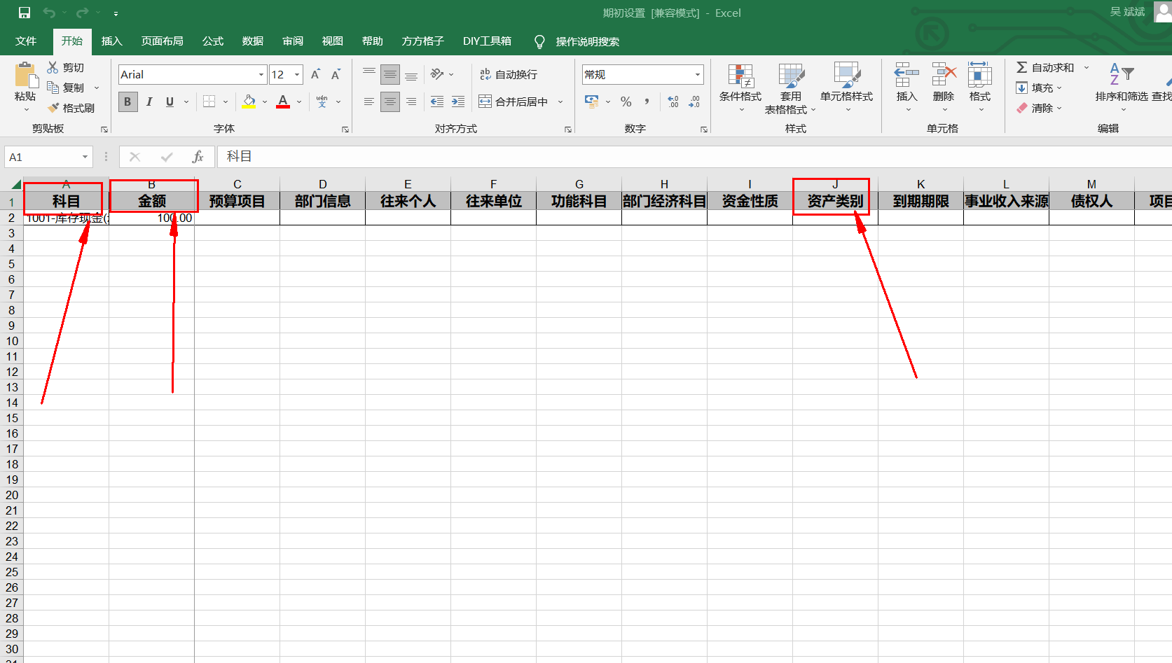 - 打开期初数模板,将资产系统中导出的固定资产期初数模板中会计科目、金额、资产类别分别复制到账务系统中期初数模板中。