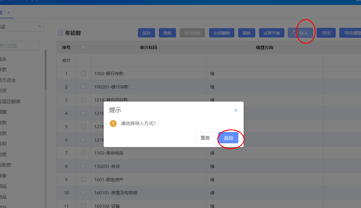 - 点击导入按钮,将期初数模板导入到系统中,点击追加按钮,完成期初数设置。