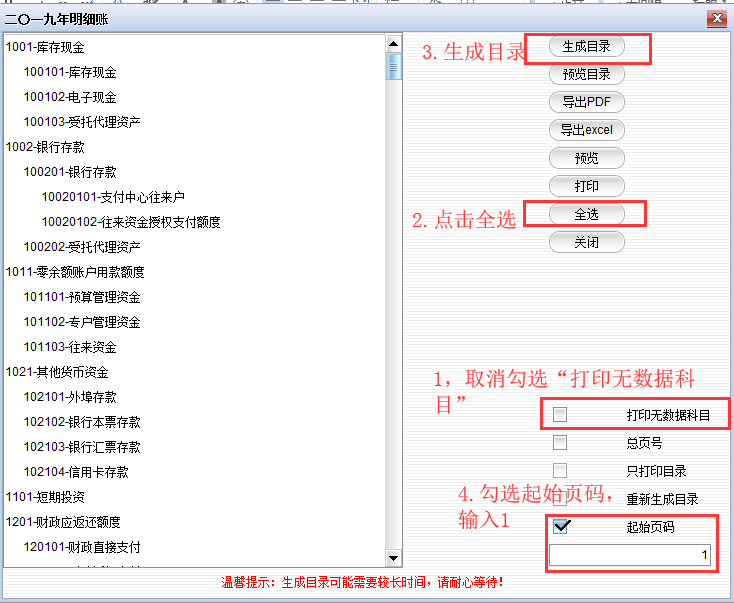 第三步:点击批量打印,在弹出页面先1、取消勾选打印无数据科目,2、点击全选按钮,3、再点击生成目录,4、最后勾选起始页码输入数字1。