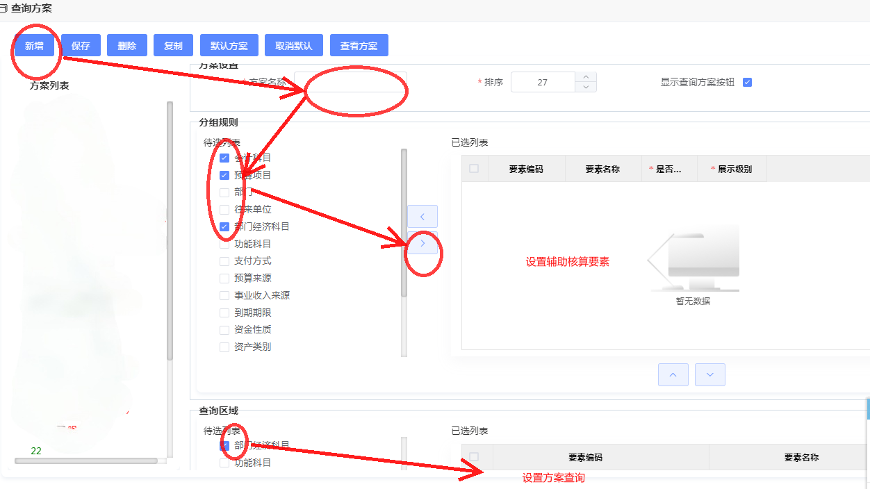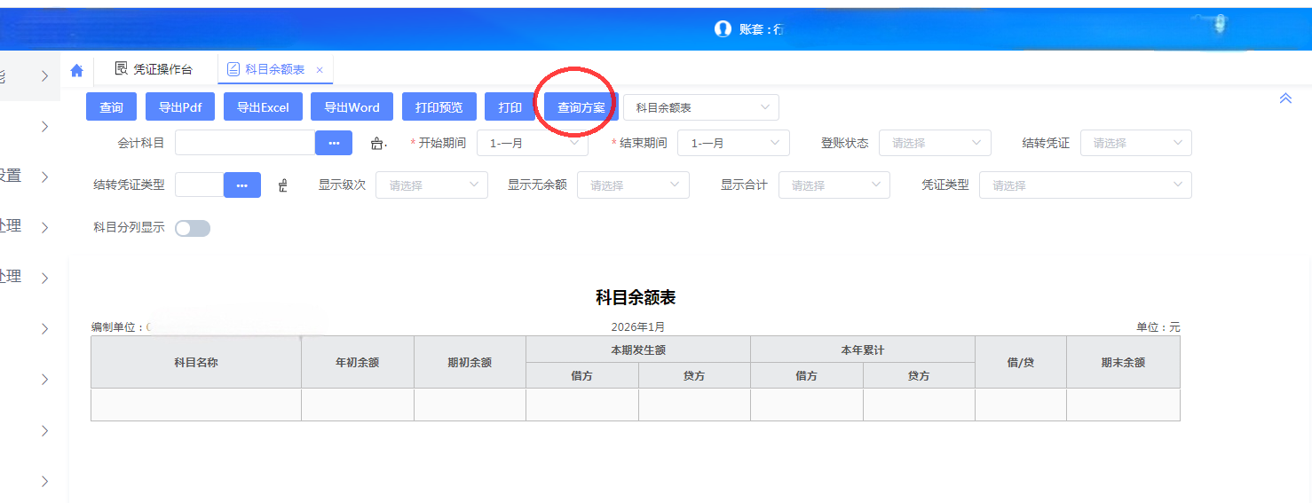 操作手册 核算云平台 2026年1月12日 账簿报表查询方案设置手册 作者 管理员 方案设置 1、点击查询方案 新增方案,方面名称根据实际用户自行命名,界面分组规则是设置需要统计的辅助要素,查询区域是设置报表方案的查询条件。 文章导航 上一篇文章上一篇 期初数据调整
